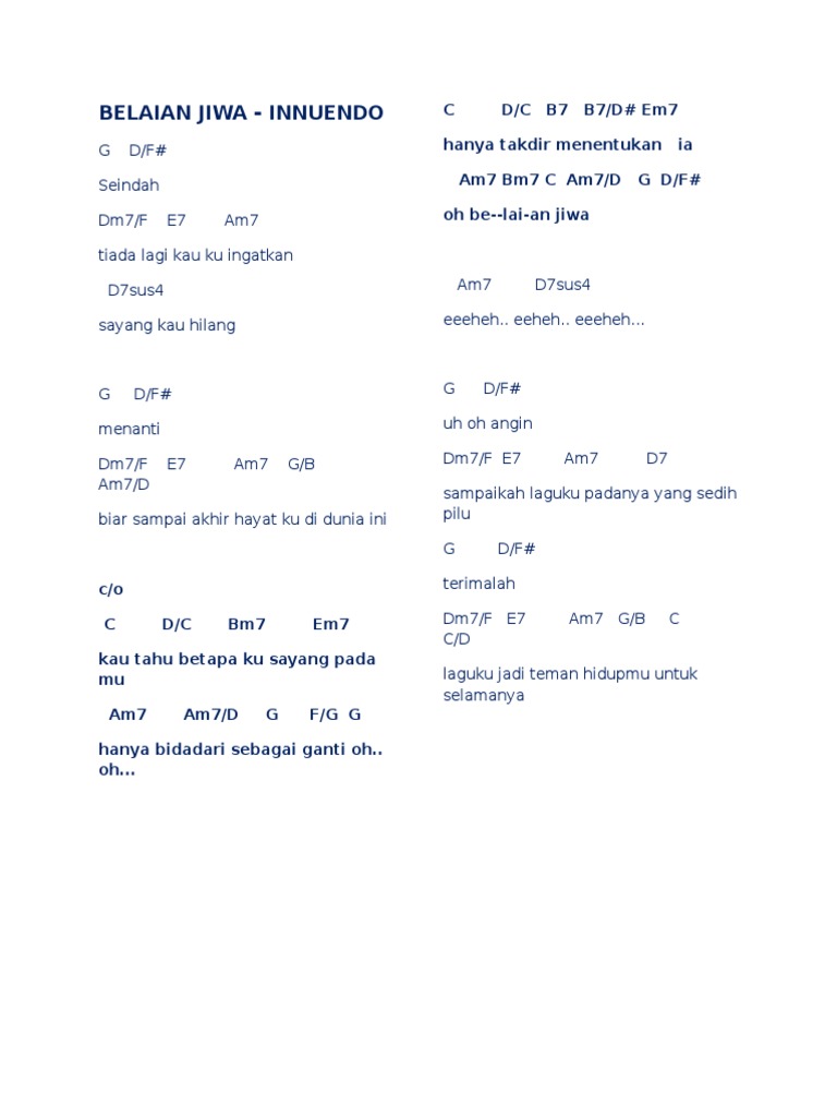 March 13 2008 3 Comments. F C D Gm Em Eb Cm Bb Am Dm A Chords for Innuendo - Belaian Jiwa with song key BPM capo transposer play along with guitar piano ukulele mandolin. CHORD ADA BAND BELAHAN JIWA.